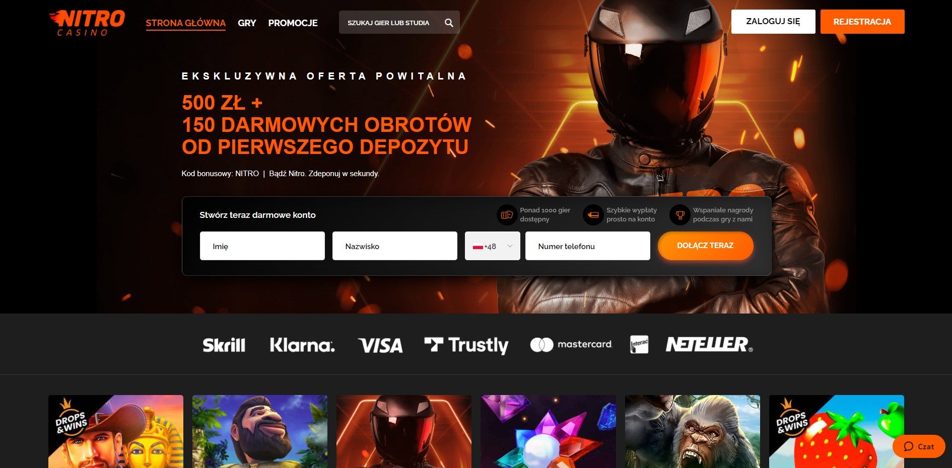 Nitro rejestracja jest niezwykle intuicyjna. Można ją przeprowadzić na dwa sposoby. Już na stronie głównej pojawia się niewielki formularz, gdzie wystarczy podać imię, nazwisko oraz numer telefonu. Następnie kasyno prześle wiadomość weryfikacyjną i użytkownik musi dopełnić reszty formalności zgodnie z wyświetlanymi na ekranie informacjami. Drugi sposób zakładania konta to klasyczne kliknięcie przycisku odpowiedzialnego za rejestrację i wypełnianie kolejnych kroków: